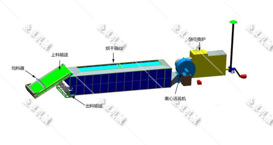 山藥片經(jīng)上料輸送帶被輸送至烘干箱體頂層網(wǎng)帶上,隨著網(wǎng)帶的傳輸呈“S”形從網(wǎng)帶上層移動至下層,烘箱內的熱空氣自下而上逐層穿透網(wǎng)帶上的山藥片,山藥片通過多層網(wǎng)帶的的多層翻轉,逐層烘干,直至山藥片烘干完成。烘干的山藥片從烘箱底層的出料口排出。