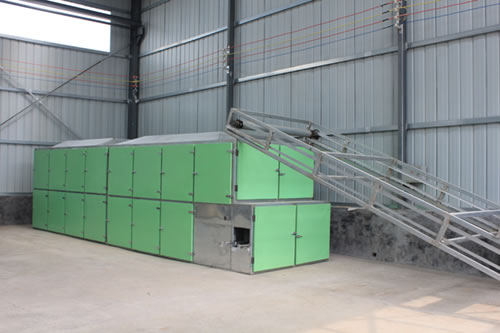 預(yù)煮處理后的蔬菜應(yīng)立即進(jìn)行冷卻(一般采用冷水沖淋),使其迅速降至常溫。冷卻后,為縮短烘干時(shí)間,可用離心機(jī)甩水,也可用簡(jiǎn)易手工方法壓瀝,待水瀝盡后,就可攤開(kāi)稍加涼曬,以備裝盤(pán)烘烤。